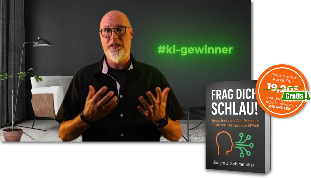 Trage dich jetzt für mein kostenloses KI-Training ein und erhalte als zusätzliches Geschenk mein E-Book "Frag dich schlau", in dem du jede Menge Tipps & Tricks und geheime Kniffe kennenlernst, mit denen du die besten Ergebnisse aus ChatGPT & Co. herausholst!
